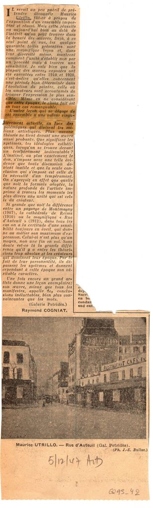 Απόκομμα, χαρτί ακανόνιστου μεγέθους, δημοσίευσης κριτικής έκθεσης Maurice Utrillo, η οποία διεξάγεται στην γκαλερί Πετρίδη στο Παρίσι.