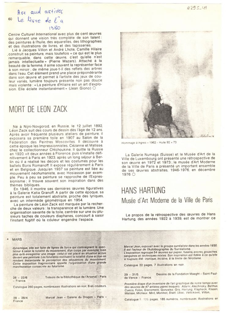 Φωτοαντίγραφο αποκόμματος, χαρτί, 30×21 εκ., στα γαλλικά, δημοσίευσης κειμένου αναφερόμενου στη ζωή και στο εικαστικό έργο του Léon Zack. Αναγράφονται βιογραφικά του καλλιτέχνη και πληροφορίες για εκθέσεις του.