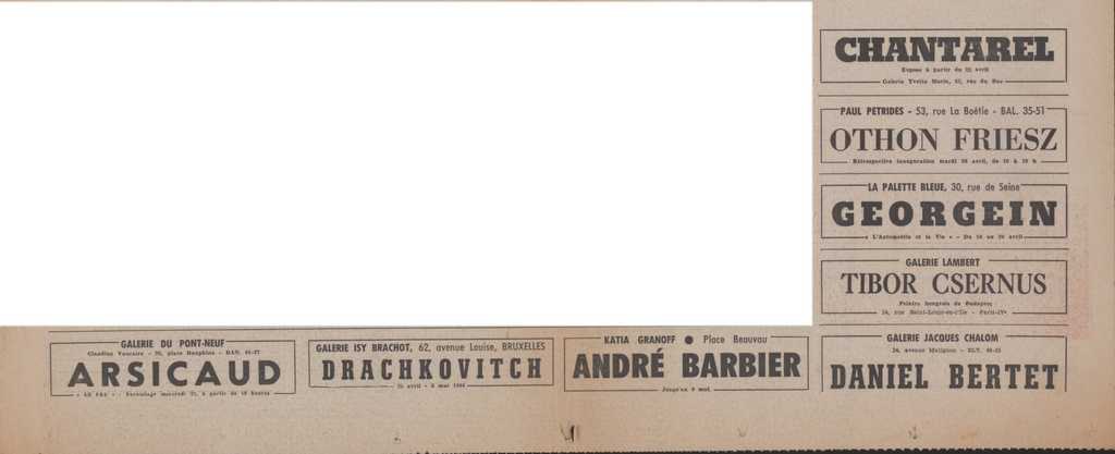 Απόκομμα, χαρτί, 60×42 εκ., στα γαλλικά, δημοσίευσης εκθεσιολογίου της περιόδου. Αναγράφονται εκθέσεις των Archicaud, Drachkovitch, Barbier, Chantarel, Friesz, Georgein, Csernus, Bertet.