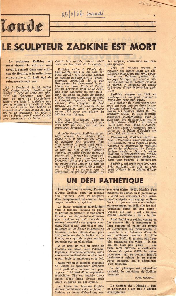 Απόκομμα, χαρτί ακανόνιστου μεγέθους, στα γαλλικά, δημοσίευσης άρθρου το οποίο αναφέρεται στον θάνατο του Ossip Zadkine. Αναγράφονται βιογραφικά του καλλιτέχνη και λεπτομέρειες για το εικαστικό του έργο.