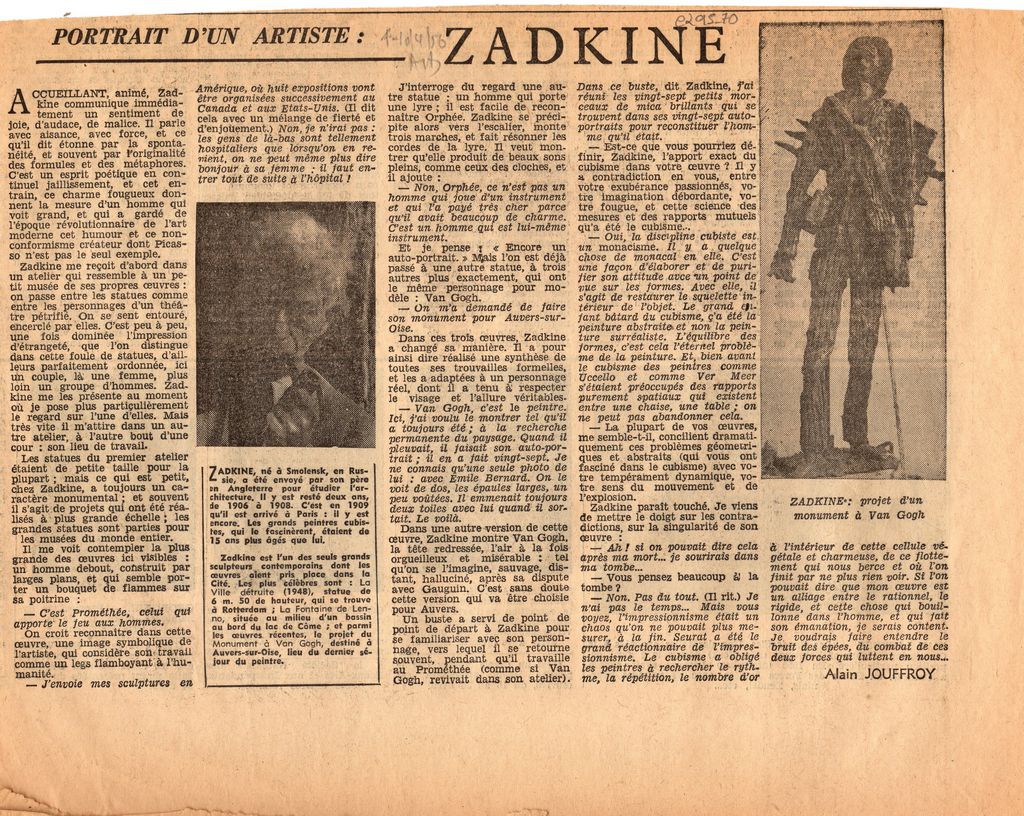 Απόκομμα, χαρτί, 22×26.5 εκ., στα γαλλικά, δημοσίευσης συνέντευξης του Ossip Zadkine, στην οποία αναφέρεται στο έργο του. Αναγράφονται βιογραφικά του καλλιτέχνη.