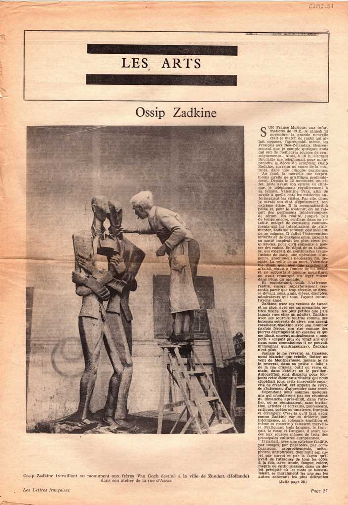 Απόκομμα, χαρτί διπλής όψης, 42×30 εκ., στα γαλλικά, δημοσίευσης άρθρου το οποίο αναφέρεται στο θάνατο του Ossip Zadkine. Αναγράφονται λεπτομέρειες για τη ζωή και το έργο του.