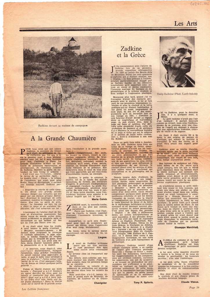 Απόκομμα, χαρτί, 42×30 εκ., στα γαλλικά, δημοσίευσης κειμένων αφιερωμένων στον Ossip Zadkine, με αφορμή τον θάνατο του καλλιτέχνη. Σχολιάζεται το εικαστικό του έργο και αναγράφονται αναμνησεις από επίσκεψη στο ατελιέ του. Δημοσιεύεται στο πλαίσιο αφιερώματος του εντύπου με αφορμή τον θάνατο του καλλιτέχνη.