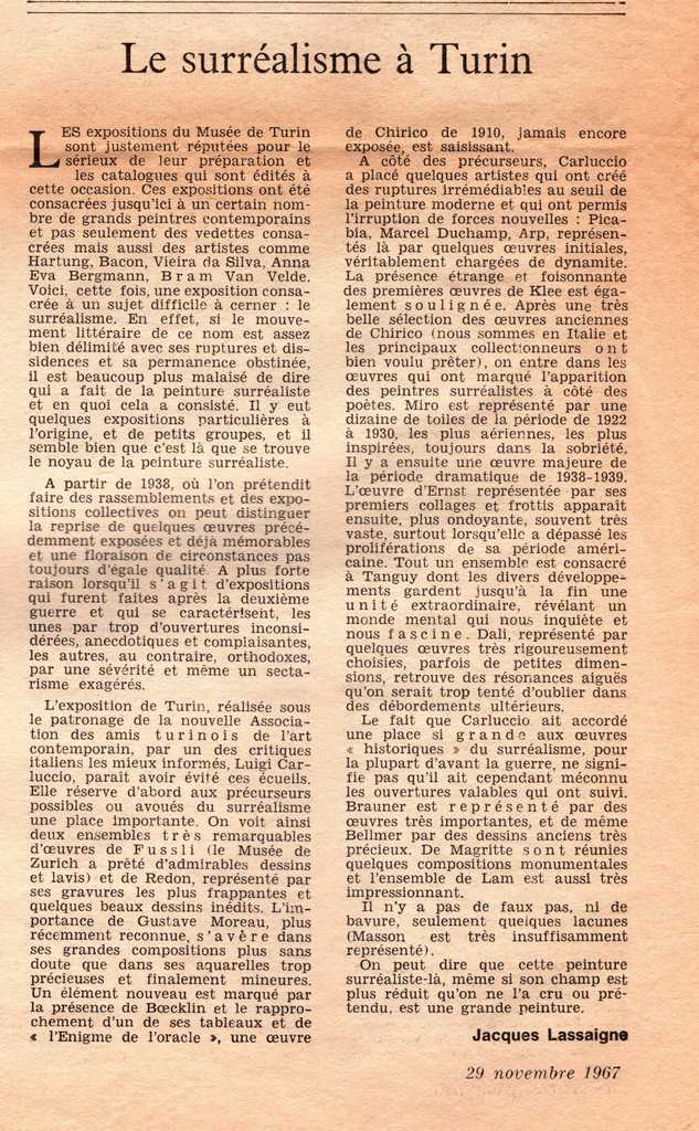 Απόκομμα, χαρτί, 42×30 εκ., στα γαλλικά, δημοσίευσης κριτικής έκθεσης έργων που εντάσσονται στο κίνημα του σουρρεαλισμού, η οποία διεξάγεται στο Τορίνο. Σχολιάζονται οι διοργανώσεις που διεξάγονται σε μουσεία και γκαλερί της πόλης για την υψηλή τους ποιότητα.