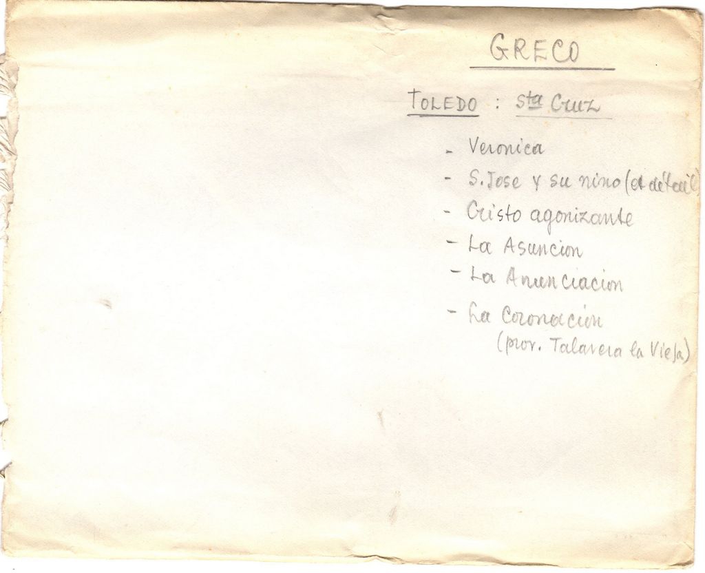Φάκελος, χαρτί, 12.5×15.5 εκ., με χειρόγραφες σημειώσεις στα ισπανικά, με μολύβι του Τώνη Σπητέρη. Αναγράφονται τίτλοι έργων του Δομήνικου Θεοτοκόπουλου.