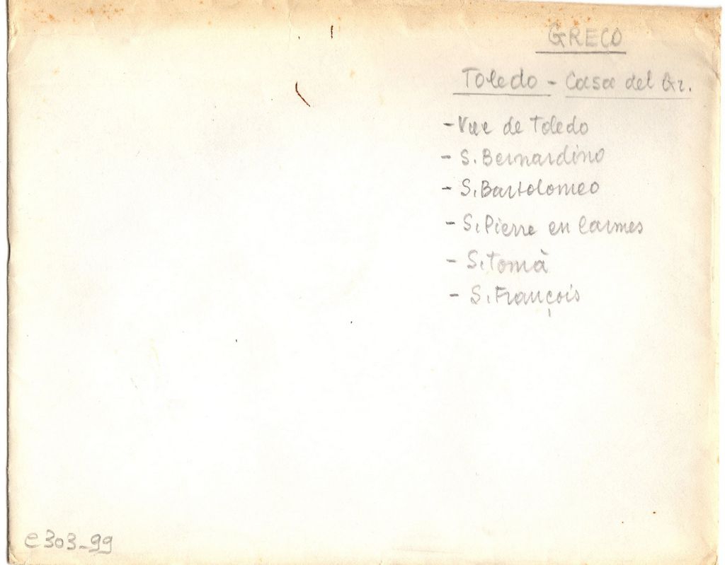 Φάκελος με χειρόγραφες σημειώσεις, με μολύβι στα ιταλικά, του Τώνη Σπητέρη. Αναγράφονται έργα του Δομήνικου Θεοτοκόπουλου.