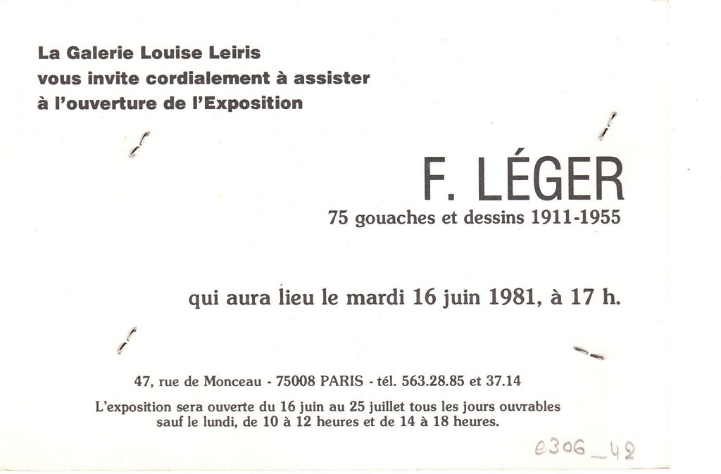 Πρόσκληση, χαρτόνι, 10,5×15 εκ., εγκαινίων έκθεσης του Fernand Léger στο Παρίσι.