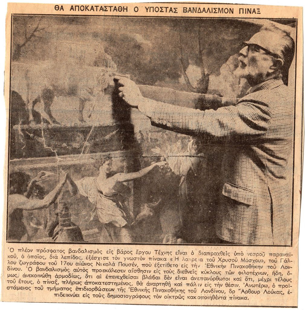 Απόκομμα εντύπου, χαρτί, 15×15 εκ., στα ελληνικά, με άρθρο αναφερόμενο σε βανδαλισμό πίνακα του Nicolas Poussin στην Εθνική Πινακοθήκη του Λονδίνου. Δίνονται σχετικές πληροφορίες.