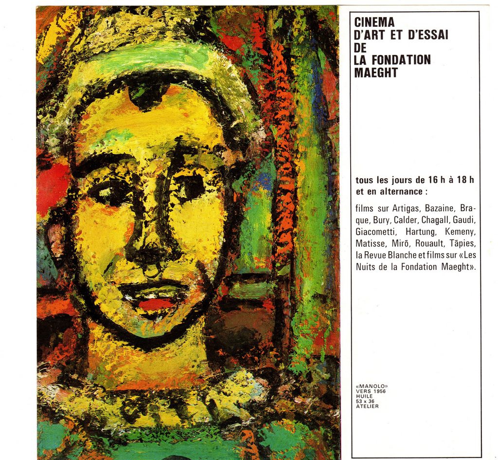 Έντυπο, χαρτί, 20.5 x 20.5 εκ., στα γαλλικά έκθεσης αφιερωμένης στον Georges Roualt και στη μόνιμη συλλογή της Fondation Maeght στο Παρίσι. Αναγράφονται κινηματογραφικές προβολές σε αφιέρωμα με τίτλο “Cinema d’ Art et d’ Essai de la Fondation Maeght”, όπου προβάλονται φιλμ για τους Artigas, Bazaine, Braque, Bury, Calder, Chagall, Gaudi, Giacometti, Hartung, Kemeny, Matisse, Miró, Rouault, Tàpies καθώς και για το Ίδρυμα. Το έντυπο εικονογραφείται.