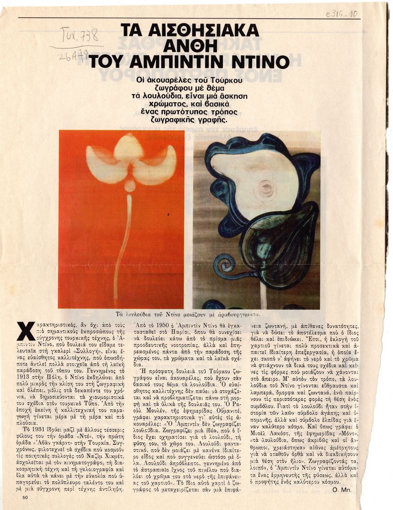 Απόκομμα, χαρτί, 30×22 εκ., στα ελληνικά, δημοσίευσης κριτικής έκθεσης του Dino Abidin, η οποία διεξάγεται στην αίθουσα Συλλογή στην Αθήνα. Σχολιάζονται έργα του καλλιτέχνη που παρουσιάζονται σε αυτή και δίνονται βιογραφικά του.