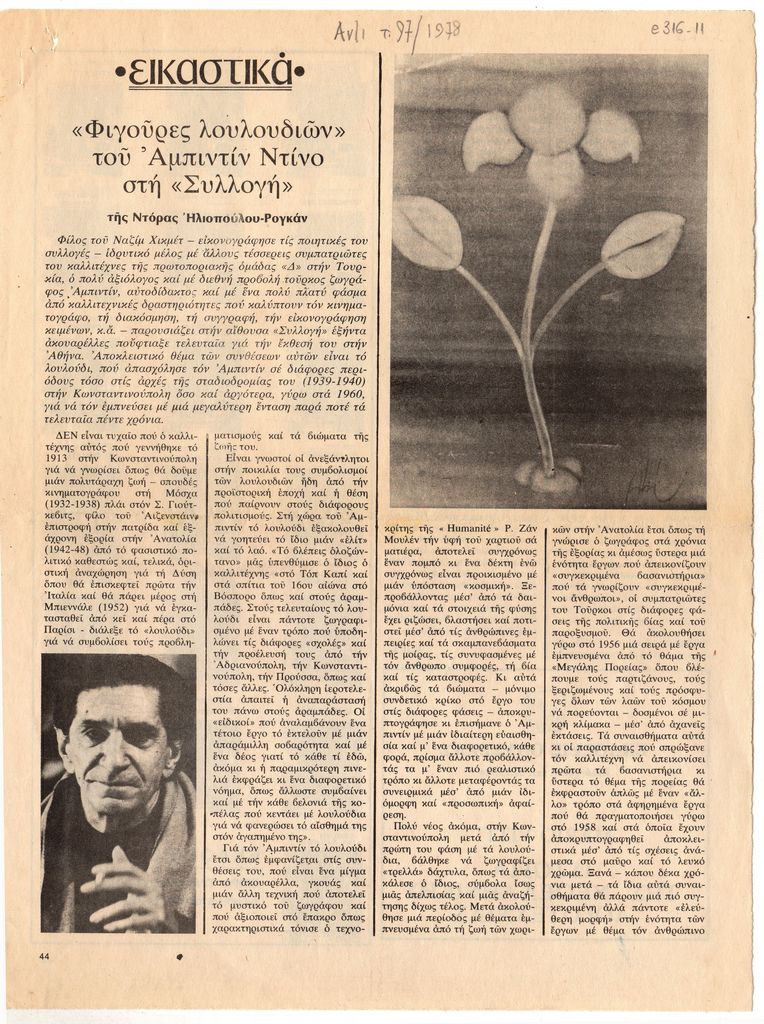 Απόκομμα, χαρτί, 2 φφ, 28×21.5 εκ., στα ελληνικά, δημοσίευσης κριτικής έκθεσης του Abidin Dino, η οποία διεξάγεται στην Αίθουσα Συλλογή στην Αθήνα. Αναγράφονται βιογραφικά του καλλιτέχνη και σχολιάζονται έργα του που παρουσιάζονται στην έκθεση. Στο ίδιο απόκομμα, άρθρο για τον Αλή Ντίνο Μπέη, γελοιογράφο.