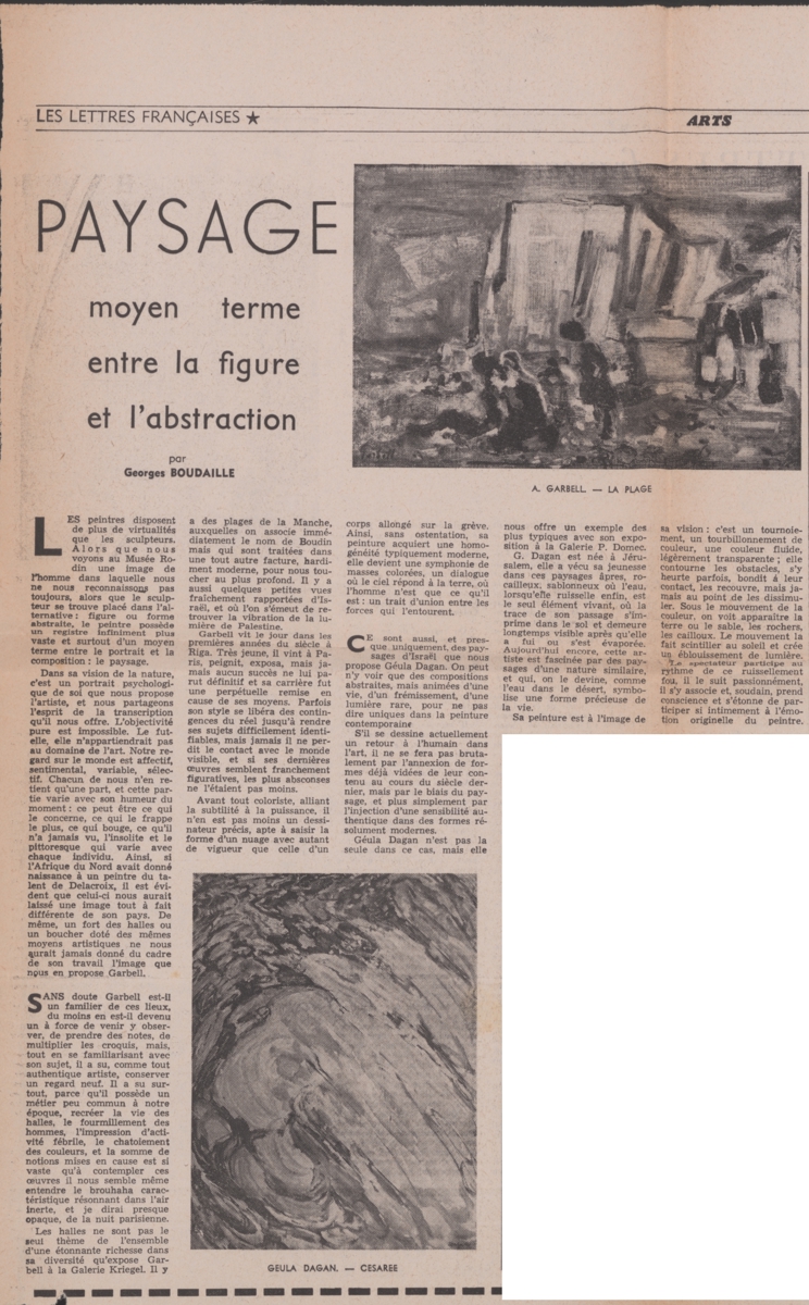 Απόκομμα, χαρτί, 40.5×42 εκ., στα γαλλικά, δημοσίευσης κριτικής εκθέσεων των Alexandre Garbell και Geula Dagan, οι οποίες διεξάγονται στις γκαλερί Pierre Domec και Kriegel στο Παρίσι.
