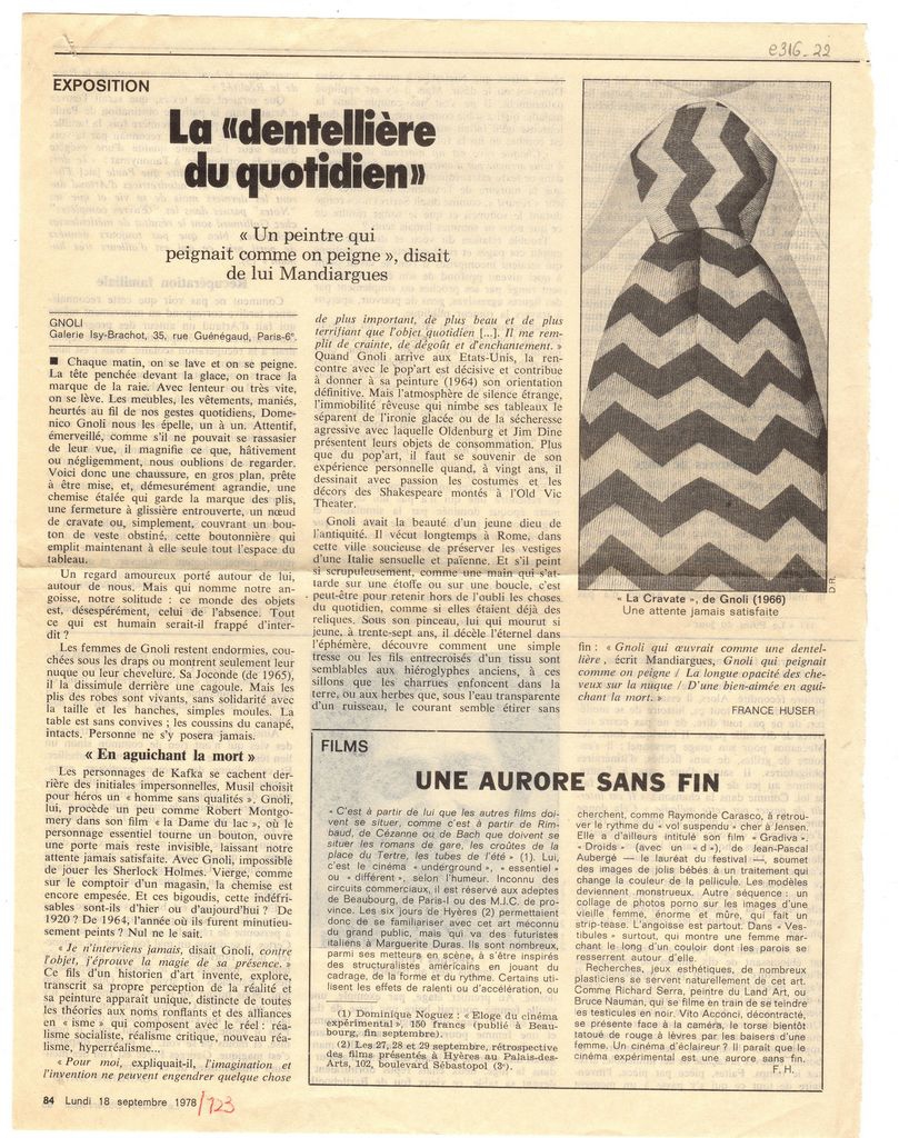 Απόκομμα, χαρτί, 30×21 εκ., στα γαλλικά, δημοσίευσης κριτικής έκθεσης του Domenico Gnoli, η οποία διεξάγεται στην γκαλερί Isy Brachot στο Παρίσι. Δίνονται βιογραφικά του καλλιτέχνη. Στο ίδιο απόκομμα, “Une Aurore sans fin”, άρθρο για τον κινηματογράφο.