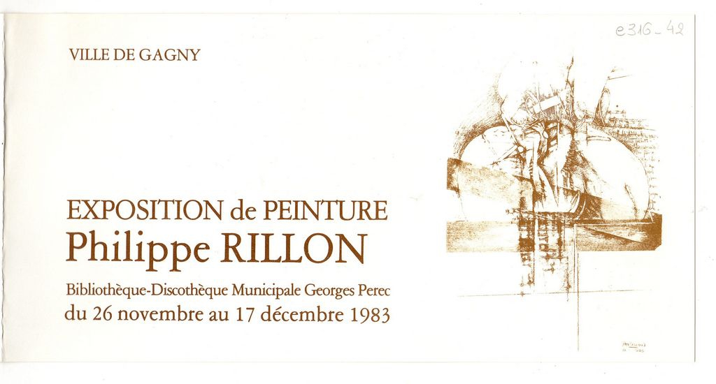 Έντυπο, χαρτόνι αναδιπλωμένο, 11×21 εκ., στα γαλλικά, έκθεσης Philippe Rillon, η οποία διεξάγεται στην Gagny της Γαλλίας.