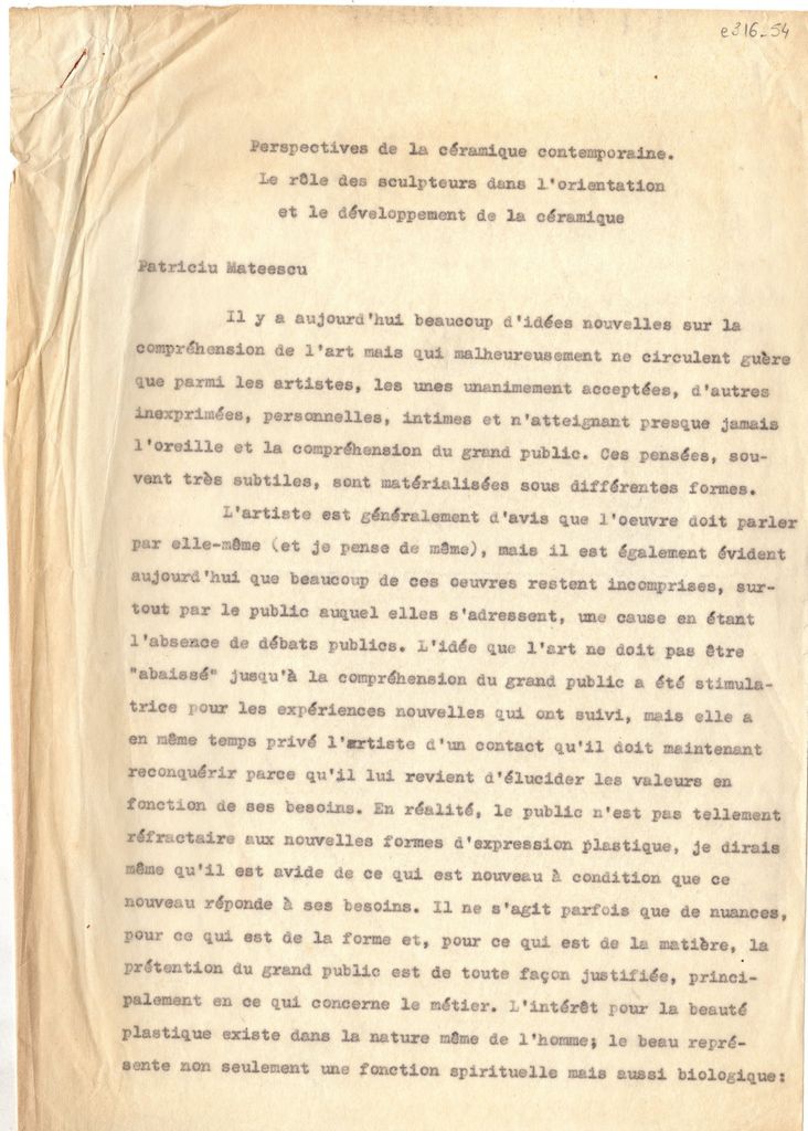 Δακτυλόγραφο κείμενο του Patriciu Mateescu, χαρτί, 10 φφ, 30×21 εκ., στα γαλλικά, αναφερόμενου στον ρόλο της γλυπτικής στην εξέλιξη της κεραμικής.
