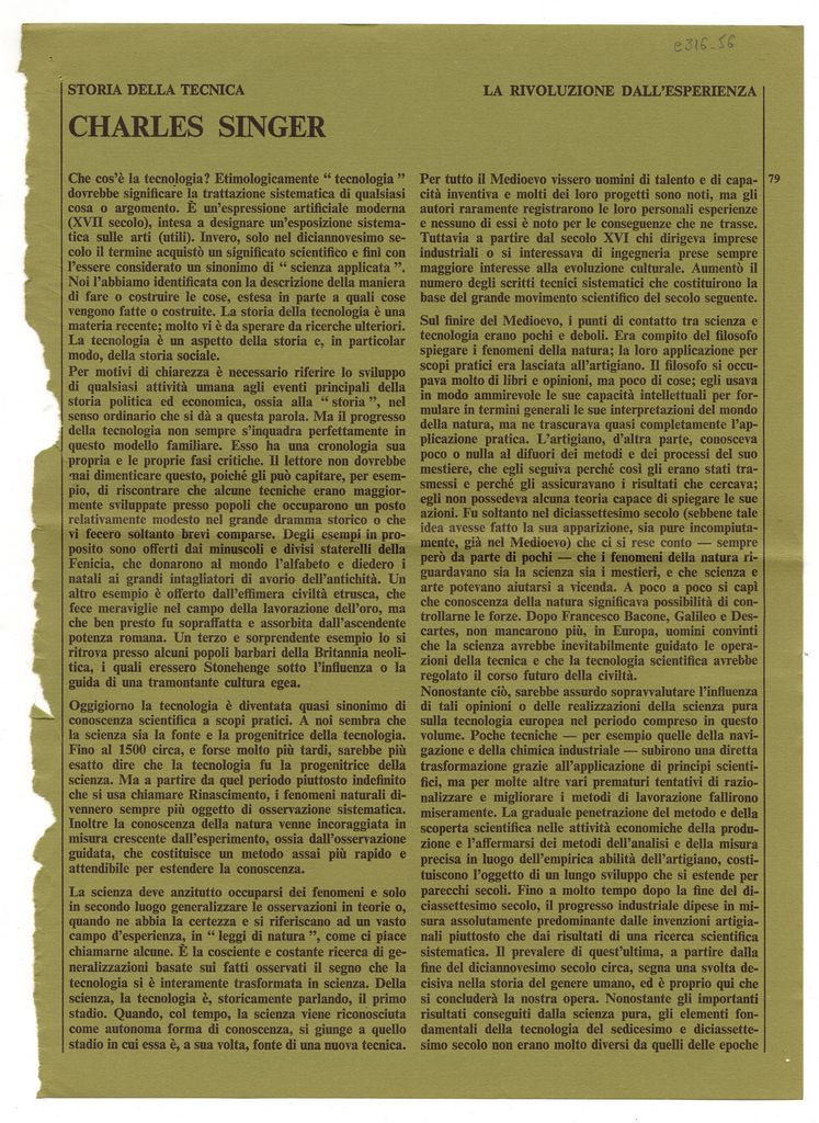 Απόκομμα, χαρτί διπλής όψης, 33×22.5 εκ., στα ιταλικά, δημοσίευσης κειμένου του Charles Singer στο οποίο αναφέρεται στην έννοια της τεχνολογίας.