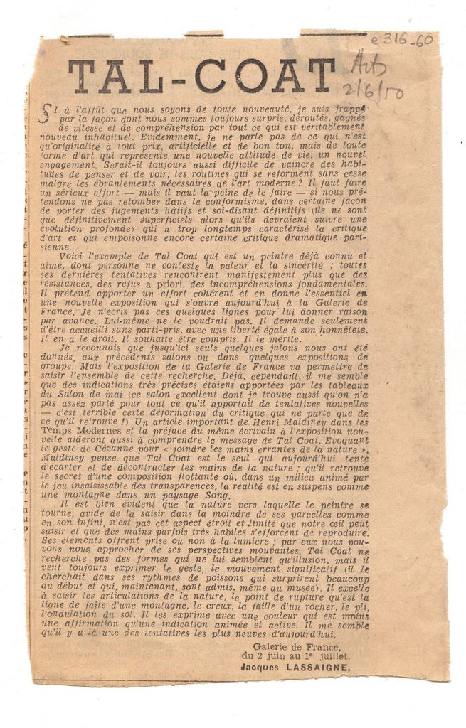 Απόκομμα, χαρτί, 18.5×12 εκ., στα γαλλικά, δημοσίευσης κριτικής έκθεσης του Pierre Tal Coat η οποία διεξάγεται στην Galerie de France στο Παρίσι. Σχολιάζεται η ζωγραφική του.