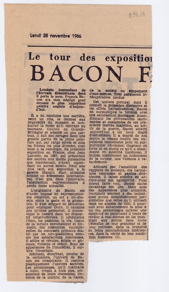 Απόκομμα, έντυπο, χαρτί, 22,0×11,3 εκ., όπου δημοσιεύεται, στα γαλλικά, κριτική της ατομικής έκθεσης έργων του Francis Bacon στο Παρίσι το 1966.