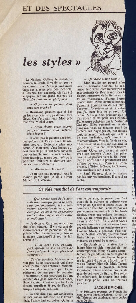 Αποκόμματα, έντυπα, χαρτί, δύο τμήματα, 50×33 εκ. (ακανόνιστο σχήμα) και 29×12 εκ., όπου δημοσιεύεται, στα γαλλικά, συνέντευξη του ζωγράφου Francis Bacon στον Jacques Michel. Στην άλλη όψη δημοσιεύονται επίσης τα εξής άρθρα: André Fernigier “La maison des morts” και J.M. “Une pyramide dans la cour Napoléon” σχετικά με τα σχέδια ανάπτυξης του Μουσείου του Λούβρου και αναγγελίες εκθέσεων της περιόδου.