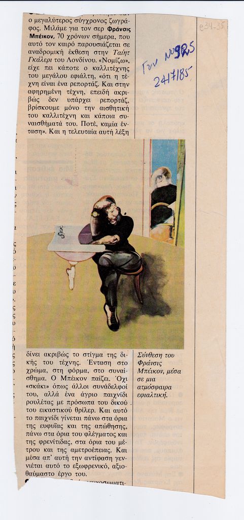 Απόκομμα, έντυπο, στα ελληνικά, χαρτί ιλουστρασιόν, 21,2×9,5 εκ., όπου δημοσιεύεται, κριτική της αναδρομικής έκθεσης έργων του Francis Bacon στο Λονδίνο το 1985.