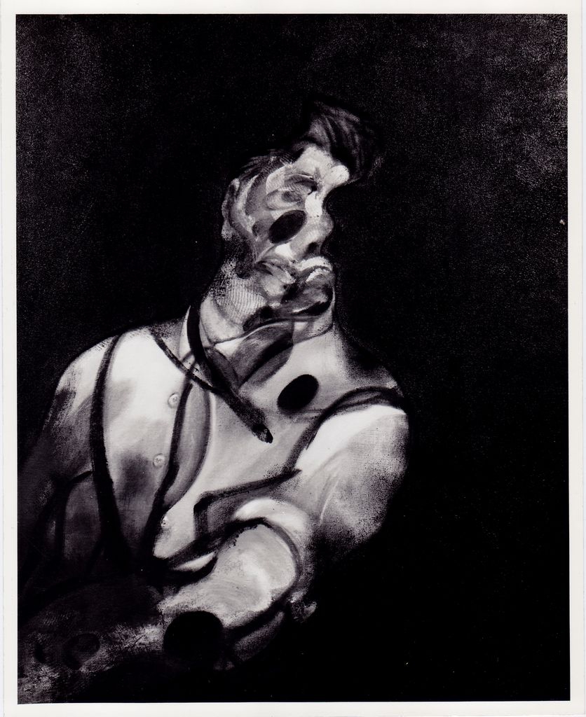 Φωτογραφία, α/μ, φωτογραφικό χαρτί, 22,5×18,2 εκ. Αναπαραγωγή του έργου του Francis Bacon “Etude pour un portrait” (1966). Στην πίσω όψη επικολλημένη ετικέτα της Galerie Maeght με τα στοιχεία του έργου, δακτυλόγραφα, στα γαλλικά, σφραγίδα δικαιωμάτων του φωτογράφου Claude Caspari και της Galerie Maeght και χειρόγραφη αρίθμηση.