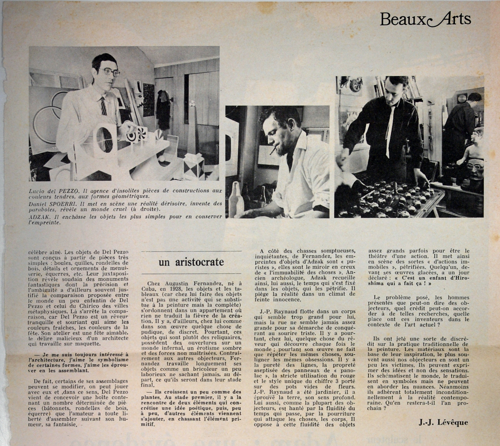 Απόκομμα, έντυπο, χαρτί, 40,0×27,0 εκ., όπου δημοσιεύεται, στα γαλλικά, απόσπασμα άρθρου του J.-J. Lévêque, όπου σχολιάζονται έργα του Lucio del Pezzo, Daniel Spoerri, Adzak και J.-P. Raynaud.