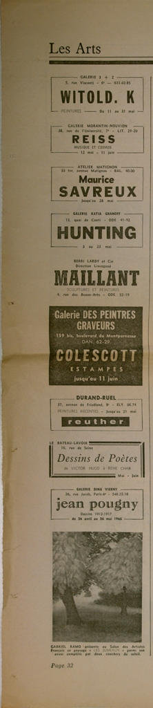 Απόκομμα, έντυπο, χαρτί, 43,0×29,7 εκ., όπου δημοσιεύονται, στα γαλλικά, αναγγελίες εκθέσεων στο Παρίσι τον Μάιο του 1966. Στο ίδιο απόκομμα δημοσιεύεται συνέντευξη του Alexandre Garbel στον Guy Weelen και απόσπασμα βιβλιοκρισίας για έκδοση με θέμα τον Seurat. Στην άλλη όψη, κριτική του Georges Boudaille για την έκθεση του H.-G. Adam στο Παρίσι το 1966.