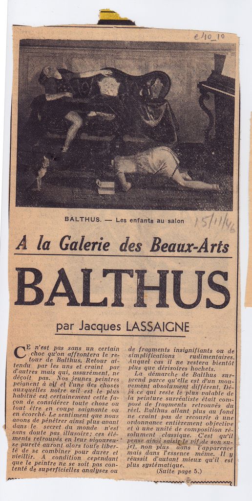 Απόκομμα, έντυπο, χαρτί, 19,5×10,5 εκ., όπου δημοσιεύεται, στα γαλλλικά, απόσπασμα κριτικής του Jacques Lassaigne για την ατομική έκθεση του Balthus στο Παρίσι το 1946. Επάνω επιγραφή με τα στοιχεία της δημοσίευσης. Στην πίσω όψη, αναπαραγωγή έργου του Fr. Masereel.