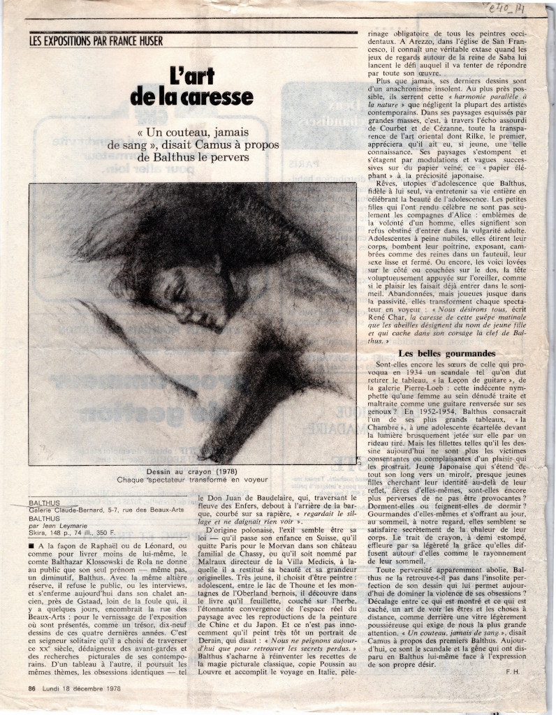 Απόκομμα, έντυπο, χαρτί, 30,5×23,0 εκ., όπου δημοσιεύεται, στα γαλλικά, άρθρο της France Huser για τον Balthus με αφορμή την ατομική έκθεση έργων του στο Παρίσι το 1978 και την παράλληλη κυκλοφορία της μελέτης το Jean Leymarie για τον καλλιτέχνη.