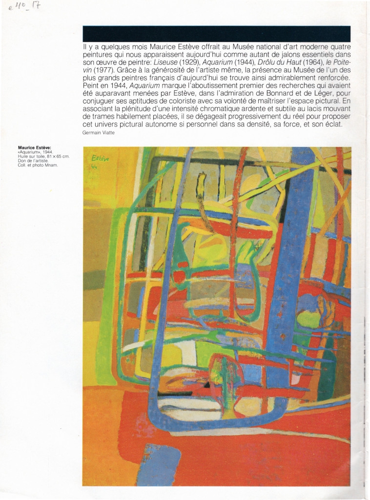 Εσώφυλλο, έντυπο, χαρτί, , 28,0×20,5 εκ., όπου δημοσιεύεται, στα γαλλικά, η αναγγελία της δωρεάς τριών έργων του ζωγράφου Maurice Estève στο Musée national d’art moderne στο Παρίσι το 1983.
