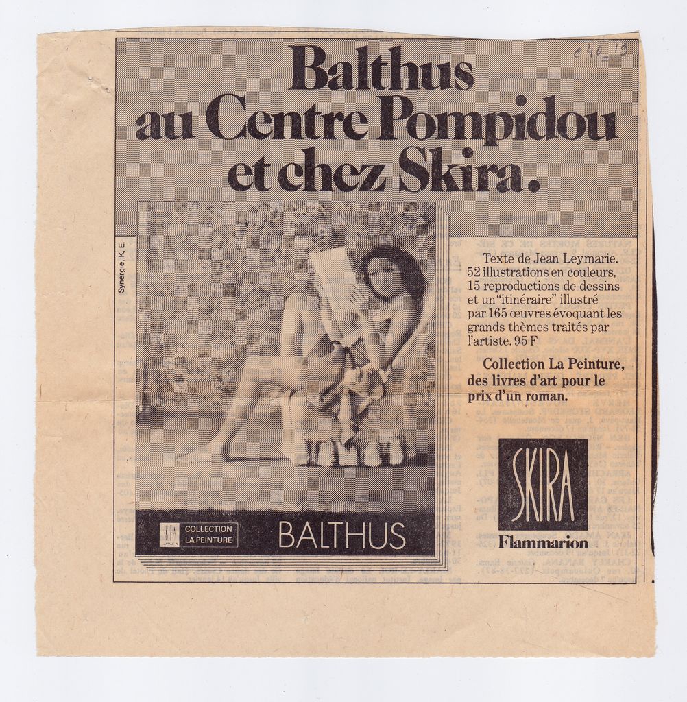 Απόκομμα, έντυπο, χαρτί, 17,2×17,2 εκ., όπου δημοσιεύεται, στα γαλλικά, διαφήμιση του βιβλίου του Jean Leymarie για το έργο του ζωγράφου Balthus. Αναφορά γίνεται επίσης στην αναδρομική έκθεση έργων του καλλιτέχνη στο Παρίσι το 1983. Στην άλλη όψη, αναγγελία εκθέσεων της περιόδου.