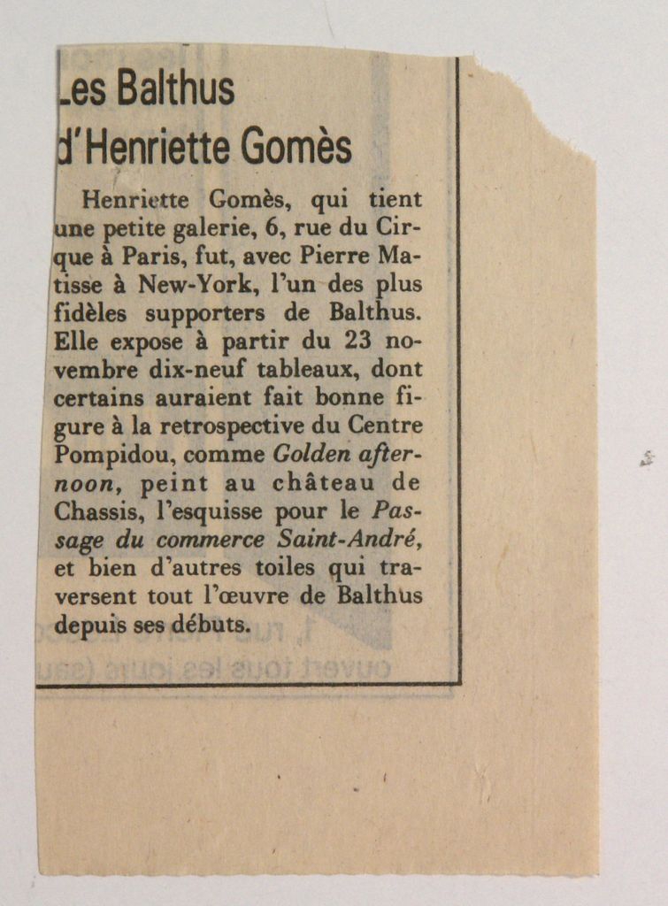 Απόκομμα, έντυπο, χαρτί, 9,5×6,3 εκ., όπου δημοσιεύεται, στα γαλλικά, σύντομο άρθρο σχετικά με την ατομική έκθεση έργων του ζωγράφου Balthus στο Παρίσι.