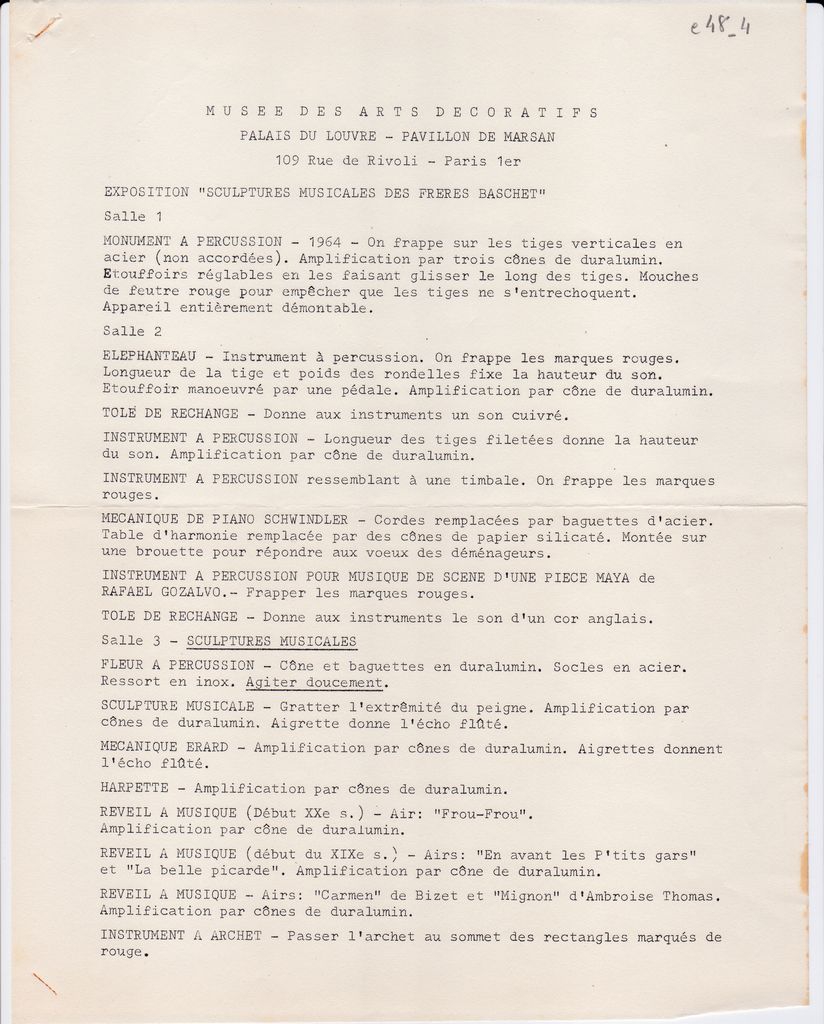 Κείμενο, δακτυλόγραφο, με μαύρο μελάνι, στα γαλλικά, χαρτί, 2 φφ., 26,8×21,0 εκ. Κατάλογος εκθεμάτων της έκθεσης μουσικών γλυπτών των αδελφών Baschet στο Παρίσι τι 1964.
