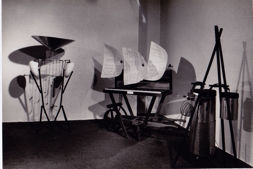 Φωτογραφία, α/μ, φωτογραφικό χαρτί, 12,6×18,0 εκ. Άποψη έκθεσης των ηχητικών γλυπτών των αδελφών Baschet στο Παρίσι το 1974. Στην πίσω όψη, επιγραφή και σφραγίδα δικαιωμάτων του μουσείου και της φωτογράφου Hélène Adant.