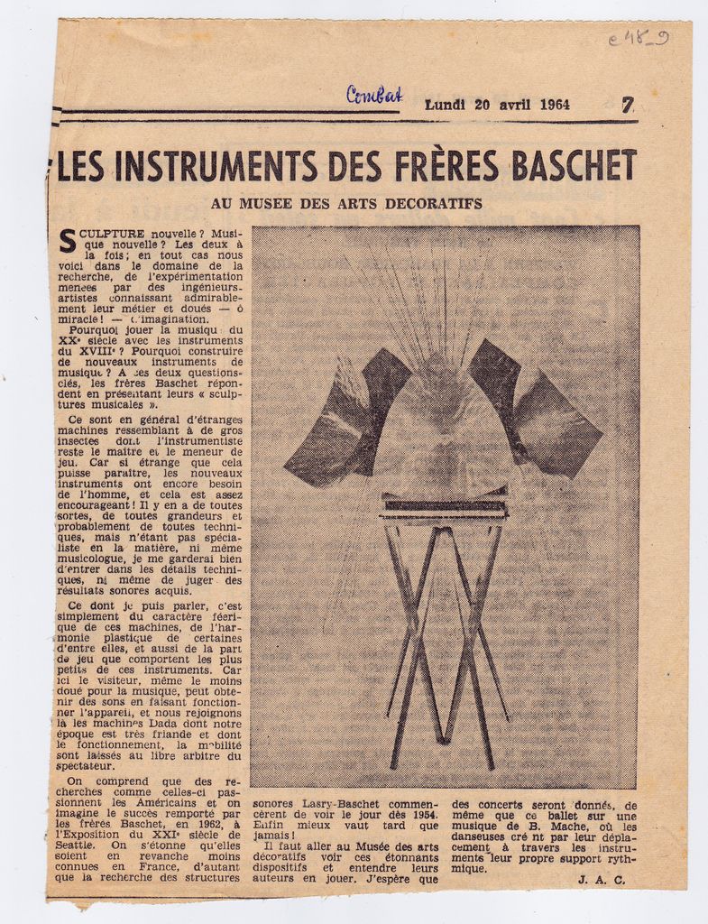Απόκομμα, έντυπο, χαρτί, 21,3×15,6 εκ., όπου δημοσιεύεται, στα γαλλικά, κριτική του J.A.C. για την έκθεση γλυπτών – μουσικών οργάνων των αδελφών Baschet στο Παρίσι το 1964. Επάνω, επιγραφή, με τα στοιχεία της δημοσίευσης.