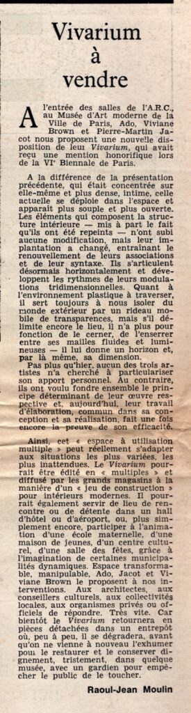 Απόκομμα, έντυπο, χαρτί, 42,8×29,5 εκ., όπου δημοσιεύεται, στα γαλλικά, άρθρο του Raoul-Jean Moulin για την έκθεση του έργου “Vivarium” των Ado, Viviane Brown και Pierre-Martin Jacot στο Musée d’Art Moderne de la Ville de Paris το 1970. Το έργο είχε αποσπάσει τιμητική διάκριστη στην 6η Biennale του Παρισιού.