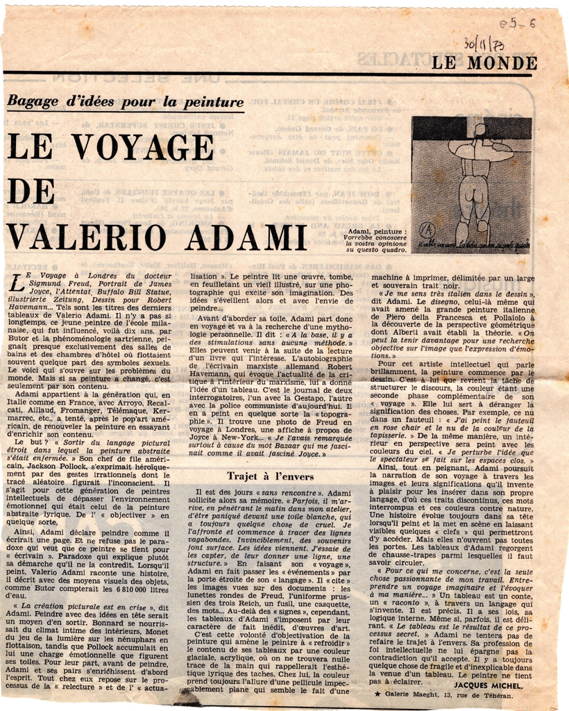 Απόκομμα, έντυπο, χαρτί, 25,8×20,5 εκ., όπου δημοσιεύεται, στα γαλλικά, άρθρο του Jacques Michel για τον Valerio Adami με αφορμή την ατομική έκθεση έργων του στην Galerie Maeght στο Παρίσι το 1973. Επάνω, επιγραφή.