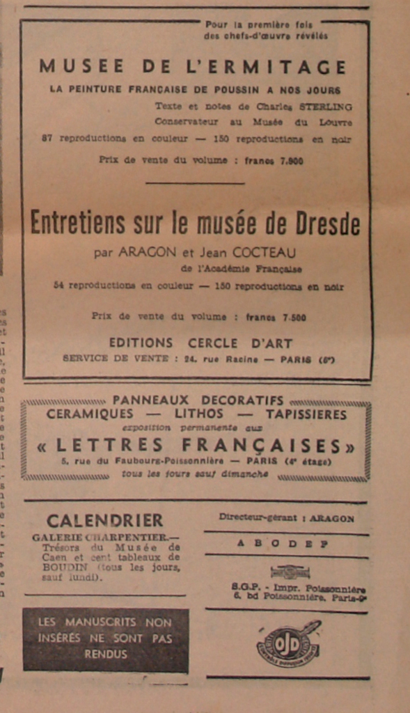 Απόκομμα, έντυπο, χαρτί, 60,0×42,0 εκ., όπου δημοσιεύονται, στα γαλλικά, η αναγγελία έκδοσης των τόμων “Musée de L’Ermitage. La Peinture française de Poussin à nos jours” με κείμενα του Charles Sterling και “Entretiens sur le musée de Dresde par Aragon et Jean Cocteau καθώς και η αναγγελία της έκθεσης με τίτλο “Trésors du Musée de Caen et cent tableux de Boudin) στο Παρίσι. Στην ίδια όψη δημοσιεύονται επίσης: σύντομο αφιέρωμα στον ζωγράφο André Bauchant με αφορμή τον θάνατό του και άρθρο για την συλλογή έργων του Pavillon de Vendôme museum στο Aix en Provence. Στην άλλη όψη, δημοσιεύεται το άρθρο “Trois ans après. Fernard Léger vivant”.