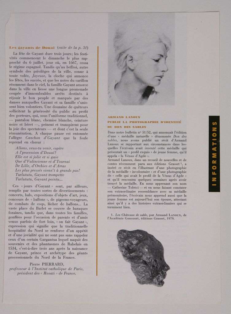 Απόκομμα, έντυπο, χαρτί ιλουστρασιόν, 3 φφ, 23,5×18,0 εκ., όπου δημοσιεύονται, στα γαλλικά, άρθρο για το “έργο” του συγγραφέα “Dons des sable”. Σε άλλες σελίδες του τεκμηρίου δημοσιεύονται: άρθρο του Lucien Lautrec και του Pierre Oster Soussouev για τον ζωγράφο Jean Bazaine και απόσπασμα άρθρου για τον ζωγράφο André Jacquemin.