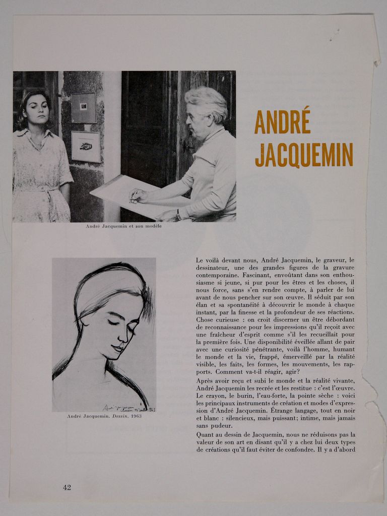 Απόκομμα, έντυπο, χαρτί ιλουστρασιόν, 3 φφ, 23,5×18,0 εκ., όπου δημοσιεύονται, στα γαλλικά, απόσπασμα άρθρου για τον ζωγράφο André Jacquemin. Σε άλλες σελίδες του τεκμηρίου δημοσιεύονται: άρθρο του Lucien Lautrec και του Pierre Oster Soussouev για τον ζωγράφο Jean Bazaine και άρθρο για τον συγγραφέα Armand Lanoux.