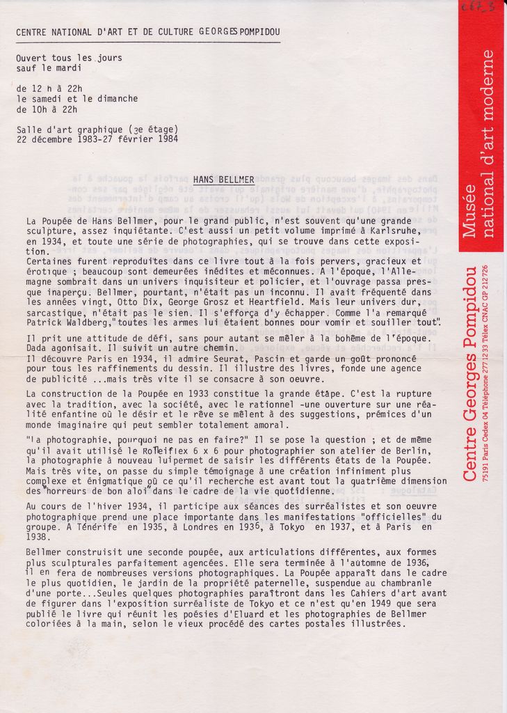 Κείμενο, δακτυλόγραφο, με μαύρο μελάνι, στα γαλλικά, σε χαρτί του Centre National d’Art et de Culture Georges Pompidou, 29,7x,21,0 εκ. Δελτίο τύπου της ατομικής έκθεσης φωτογραφίας του γερμανού ζωγράφου Hans Bellmer στο Παρίσι το 1983/4.