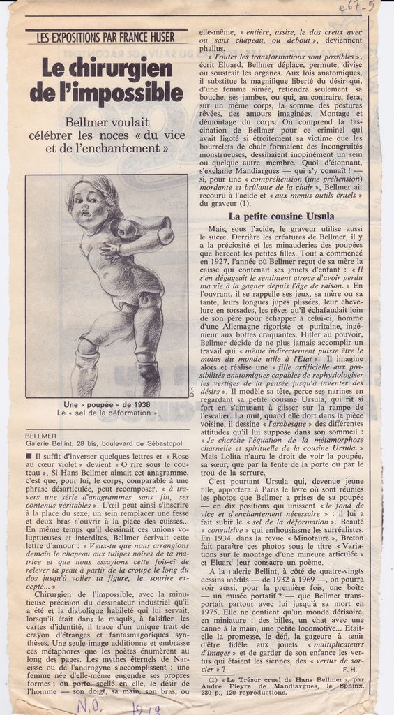 Απόκομμα, έντυπο, χαρτί, 30,3×15,5 εκ., όπου δημοσιεύεται, στα γαλλικά, κριτική του France Huser για την ατομική έκθεση έργων του Γερμανού καλλιτέχνη Hans Bellmer στο Παρίσι το 1978. Εντάσσεται στη στήλη: “Les expositions par France Huser”. Κάτω, επιγραφή με τα στοιχεία της δημοσίευσης.