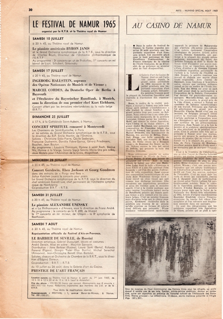 Απόκομμα, έντυπο, χαρτί, 42,5×30,0εκ, όπου δημοσιεύεται, στα γαλλικά, δημοσιεύεται το άρθρο “Au Casino de Namur” σχετικά με την οργάνωση ομαδικής έκθεσης Γάλλων καλλιτεχνών στο πλαίσιο του Festival de Namur 1965. Αριστερά στη σελίδα, το πρόγραμμα συναυλιών του φεστιβάλ. Κάτω δεξιά, αναγγελία της ατομικής έκθεσης του/της Sperber στο Παρίσι το 1965. Στην άλλη όψη, άρθρο του νευροψυχίατρου Henri Baruk για την εικονογράφηση των Ψαλμών από τον Benn.