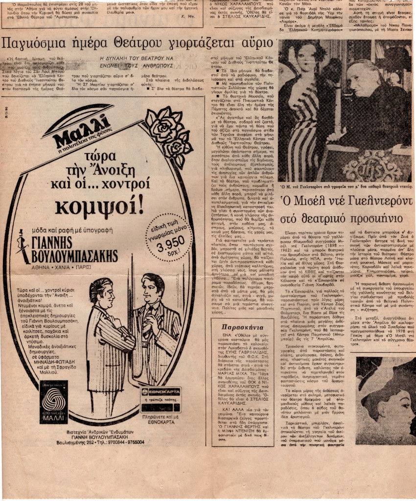 Απόκομμα, έντυπο, χαρτί, όπου δημοσιεύεται, στα ελληνικά, άρθρο για τον θεατρικό συγγραφέα Michel de Ghelderode με αφορμή τον θάνατό του. Στο ίδιο τεκμήριο, δημοσιεύεται επίσης άρθρο με τίτλο “Παγκόσμια ημέρα Θεάτρου γιορτάζεται αύριο” και αναγγελία της θεατρικής παραγωγής του έργου του Shakespeare “Οθέλος” σε σκηνοθεσία Εύη Γαβριηλίδη. Στην άλλη όψη, άρθρο του Εμμανουήλ Μαυρομμάτη για το έργο του Μπεν και το κίνημα Φλούξους.