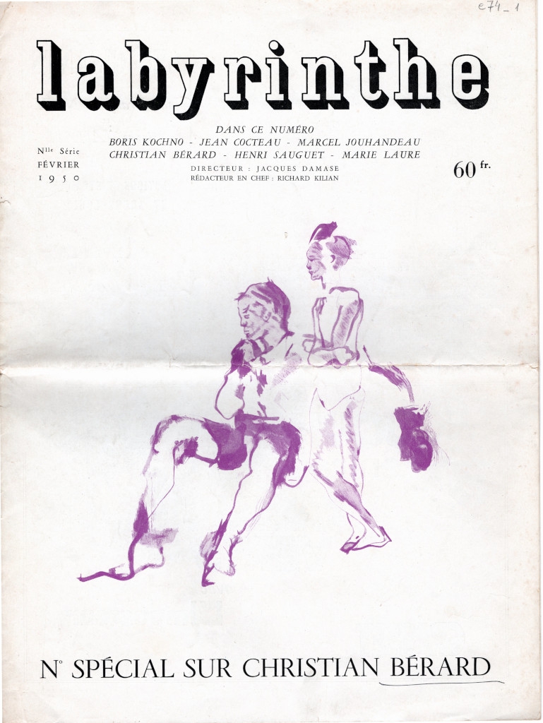 Έντυπο, στα γαλλικά, χαρτί ιλουστρασιόν, 40,0×27,7 εκ. Τεύχος του περιοδικού “Labyrinthe” αφιερωμένο στον Christian Bérard. Περιέχει κείμενα των Boris Cochno, Jean Cocteau, Marcel Jouhandreau, Christian Bérard, Henri Sauguet και Marie-Laure. Στο οπισθόφυλλο, σφραγίδα της Librairie Kaufmann.