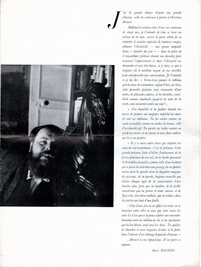 Έντυπο, χαρτί ιλουστρασιόν, 40,0×27,7 εκ., όπου δημοσιεύεται, στα γαλλικά, κείμενο του Boris Kochno για τον ζωγράφο Christian Bérard. Περιλαμβάνεται στα κείμενα τεύχους-αφιερώματος του περιοδικού “Labyrinthe” στον καλλιτέχνη, όπου δημοσιεύονται επίσης των Boris Cochno, Jean Cocteau, Marcel Jouhandreau, Christian Bérard, Henri Sauguet και Marie-Laure.