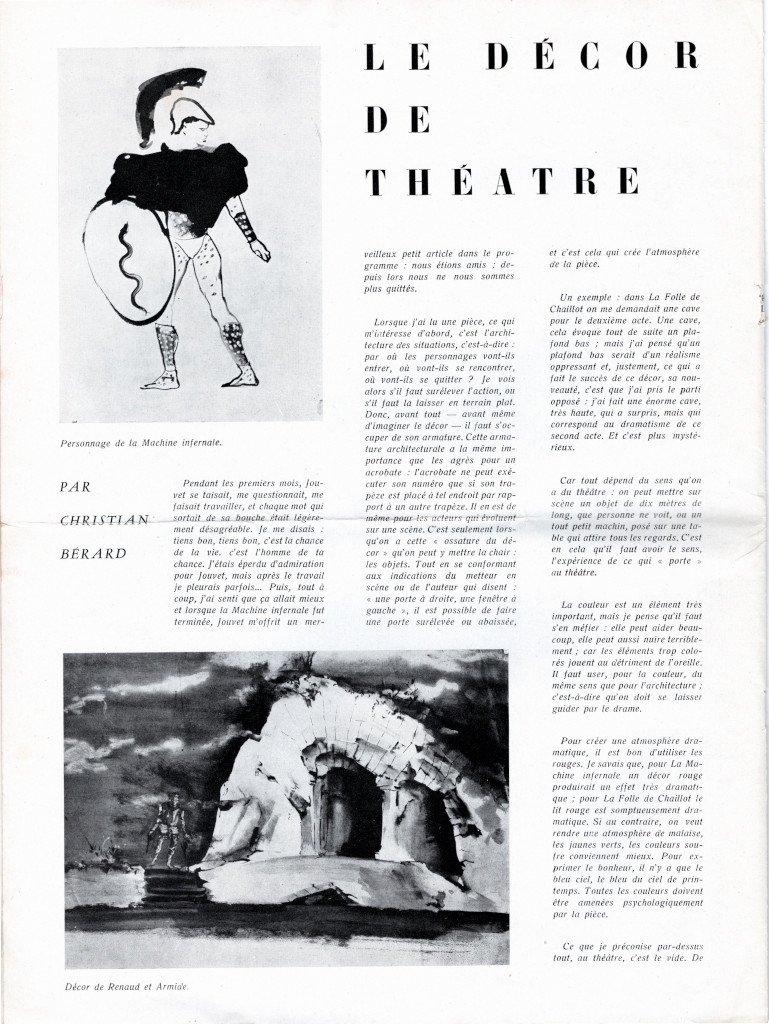 Έντυπο, χαρτί ιλουστρασιόν, 40,0×27,7 εκ., όπου δημοσιεύεται, στα γαλλικά, άρθρο του ζωγράφου Christian Bérard τη σκηνογραφία στο θέατρο. Περιλαμβάνεται σε τεύχος-αφιέρωμα του περιοδικού “Labyrinthe” στον καλλιτέχνη, όπου δημοσιεύονται επίσης κείμενα των Boris Cochno, Jean Cocteau, Marcel Jouhandreau, Henri Sauguet και Marie-Laure.