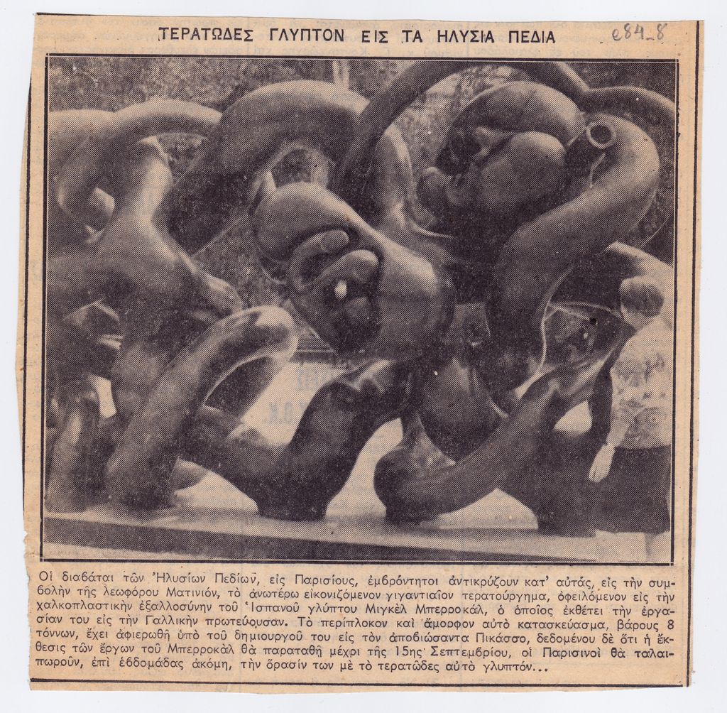 Απόκομμα, χαρτί, 14,5 x 15 εκ., στα ελληνικά, δημοσίευσης κειμένου το οποίο αναφέρεται σε έργο του Miguel Berrocal, το οποίο βρίσκεται σε λεωφόρο των Ηλυσίων Πεδίων στο Παρίσι. Σχολιάζεται ως ‘τερατούργημα’, παρουσιάζεται στο πλαίσιο έκθεσης του καλλιτέχνη στο Παρίσι και είναι αφιερωμένο στον Pablo Picasso.