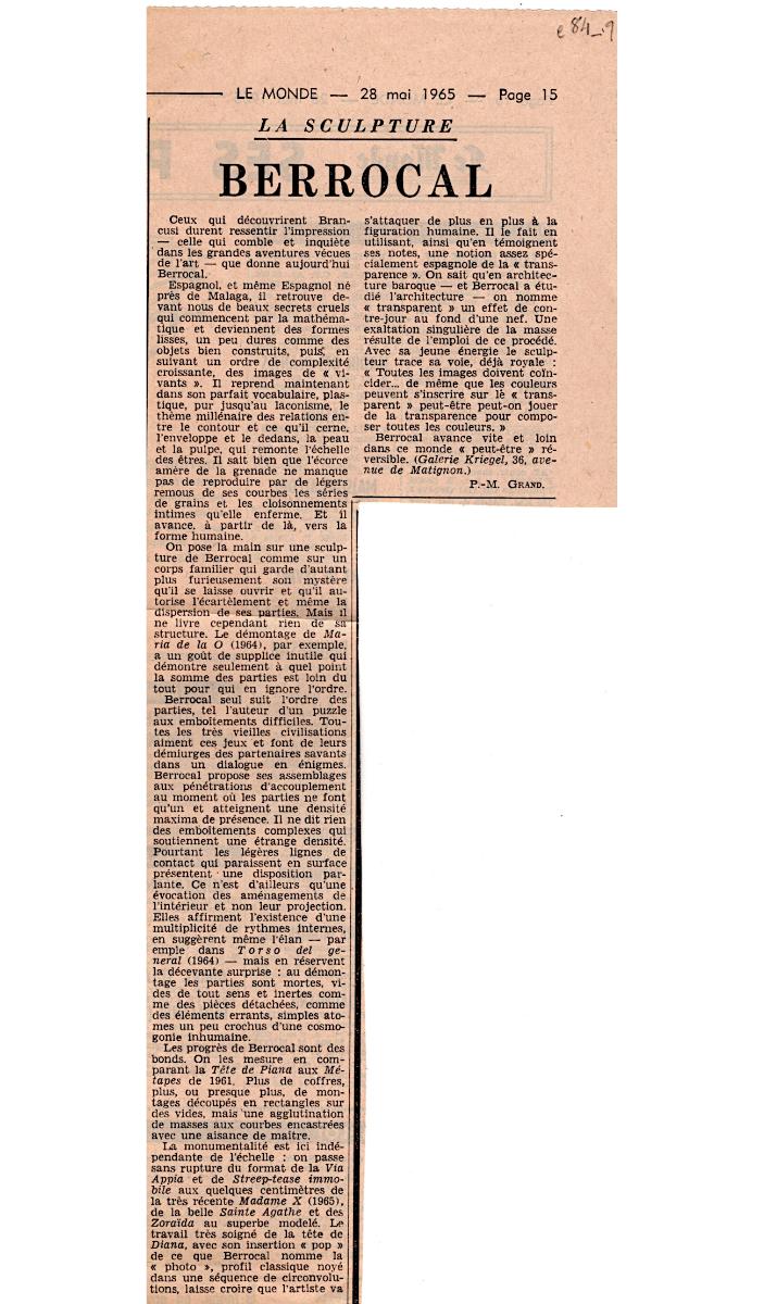 Απόκομμα, χαρτί ακανόνιστου μεγέθους, στα γαλλικά, δημοσίευσης κριτικής έκθεσης του Miguel Berrocal, η οποία διεξάγεται στο Παρίσι. Σχολιάζονται έργα του καλλιτέχνη.