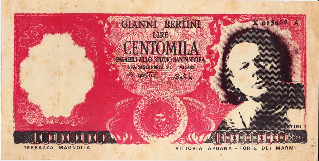Πρόσκληση, χαρτόνι διπλής όψης, 29,5 x 15 εκ., στα ιταλικά, εγκαινίων έκθεσης του Gianni Bertini στο Μιλάνο.